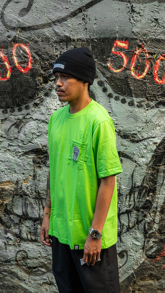 TG NEON GREEN BEANIE OLD ENGLISH EMBRO
